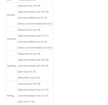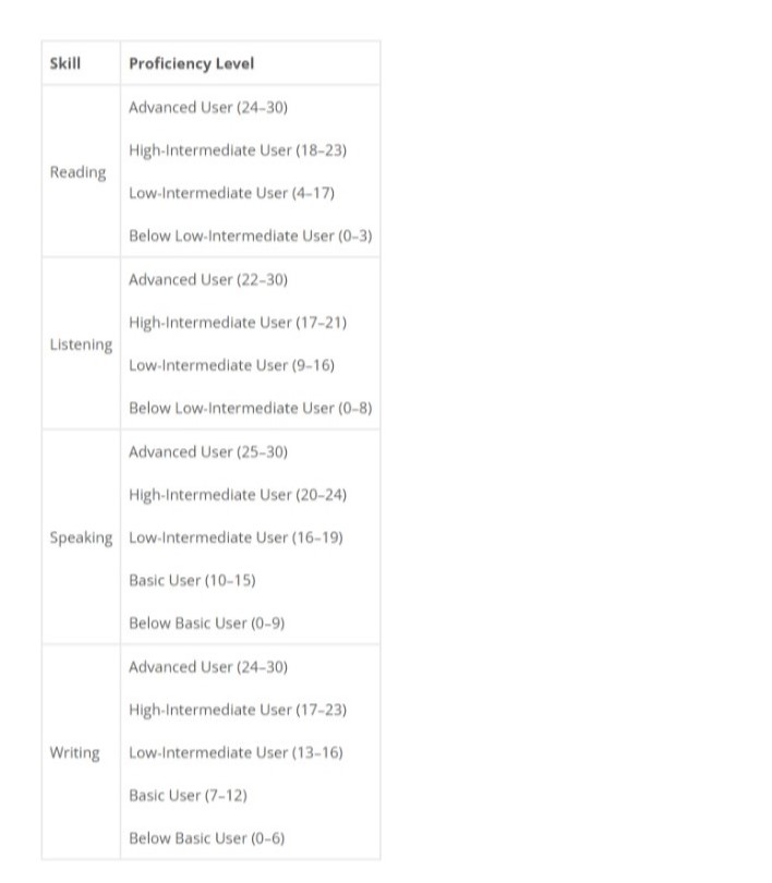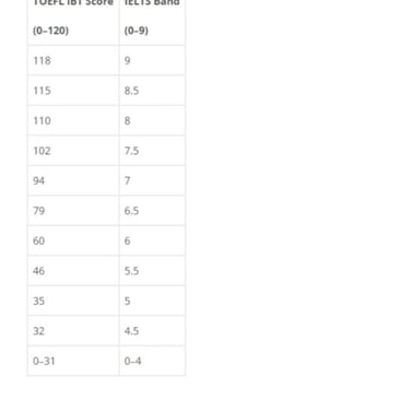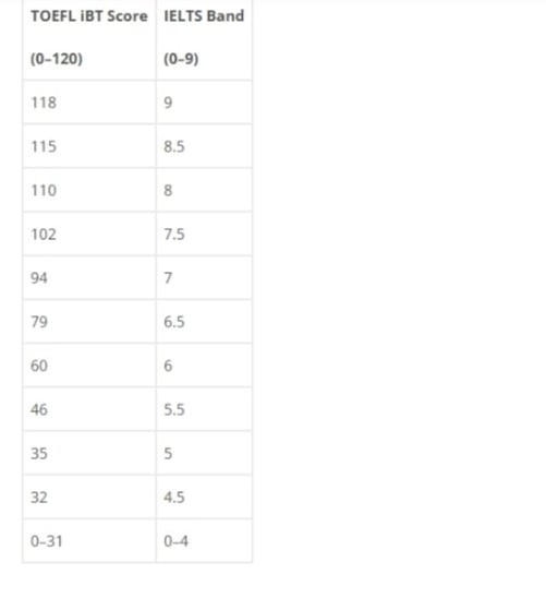 TOEFL and IELTS score comparison table